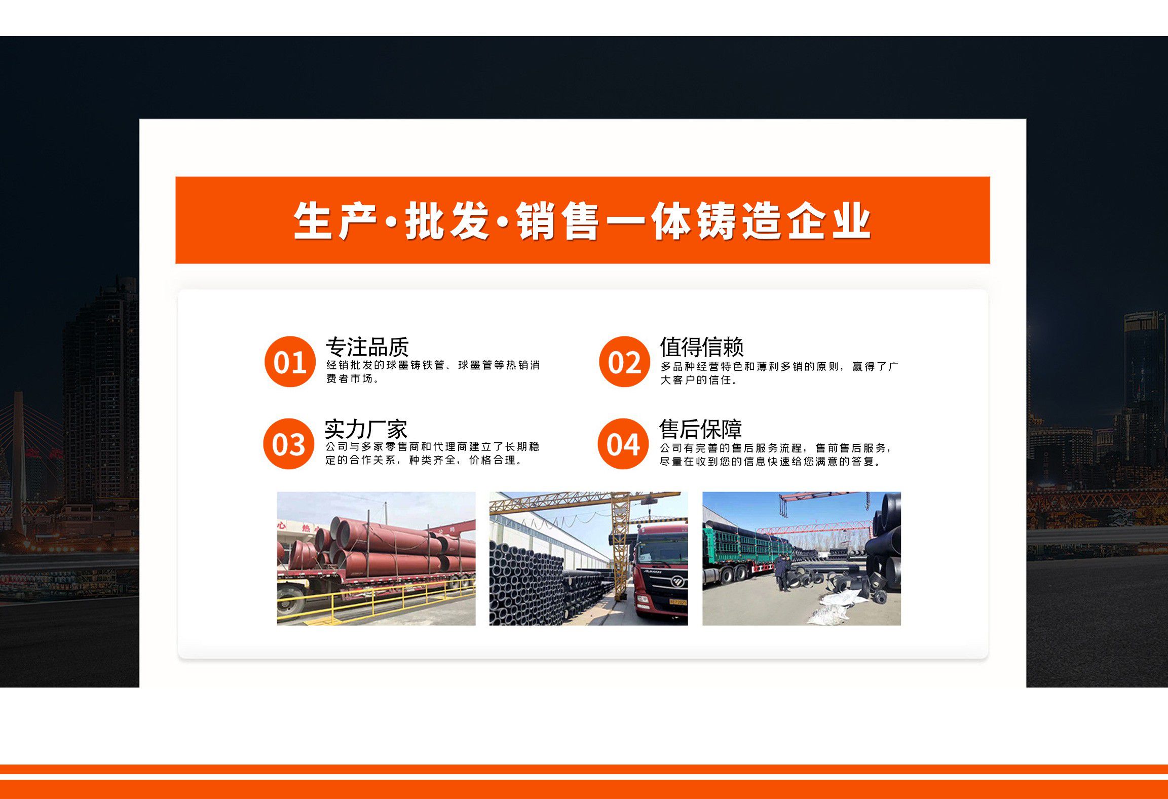 青島金源達(dá)管業(yè)有限公司主要經(jīng)營各種規(guī)格球墨鑄鐵管,球墨管,球墨鑄鐵管廠家等產(chǎn)品,質(zhì)量可靠,誠信經(jīng)營,值得信賴! 青島金源達(dá)管業(yè)有限公司始終堅持“誠信立業(yè),追求卓越,合作共贏,共同發(fā)展”,竭誠歡迎各界朋友來廠參觀指導(dǎo),洽談業(yè)務(wù)。我們愿與您攜手共進(jìn),互惠雙贏,共創(chuàng)未來! 公司堅持“以奮斗者為本”的理念,關(guān)心關(guān)愛職工,職工的獲得感、幸福感更加充實、更有保障、更可持續(xù);秉承“忠誠企業(yè)、勇于擔(dān)當(dāng)、開拓創(chuàng)新、主動作為”,堅持黨建領(lǐng)航、創(chuàng)新驅(qū)動、文化塑魂、奉獻(xiàn)社會,全面致力于綠色、低碳、高效、高質(zhì)量發(fā)展。 愿與各界朋友攜手并進(jìn),共創(chuàng)未來!...